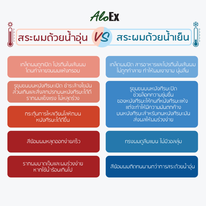 วันนี้ AloEx จะสรุปแบบง่ายๆ ให้เข้าใจว่า อุณหภูมิของน้ำที่แตกต่างกันจะมีผลต่อเส้นผมอย่างไร พร้อมทั้งแนะนำเทคนิคการดูแลเส้นผมและหนังศีรษะให้แข็งแรงถาวรด้วยค่ะ